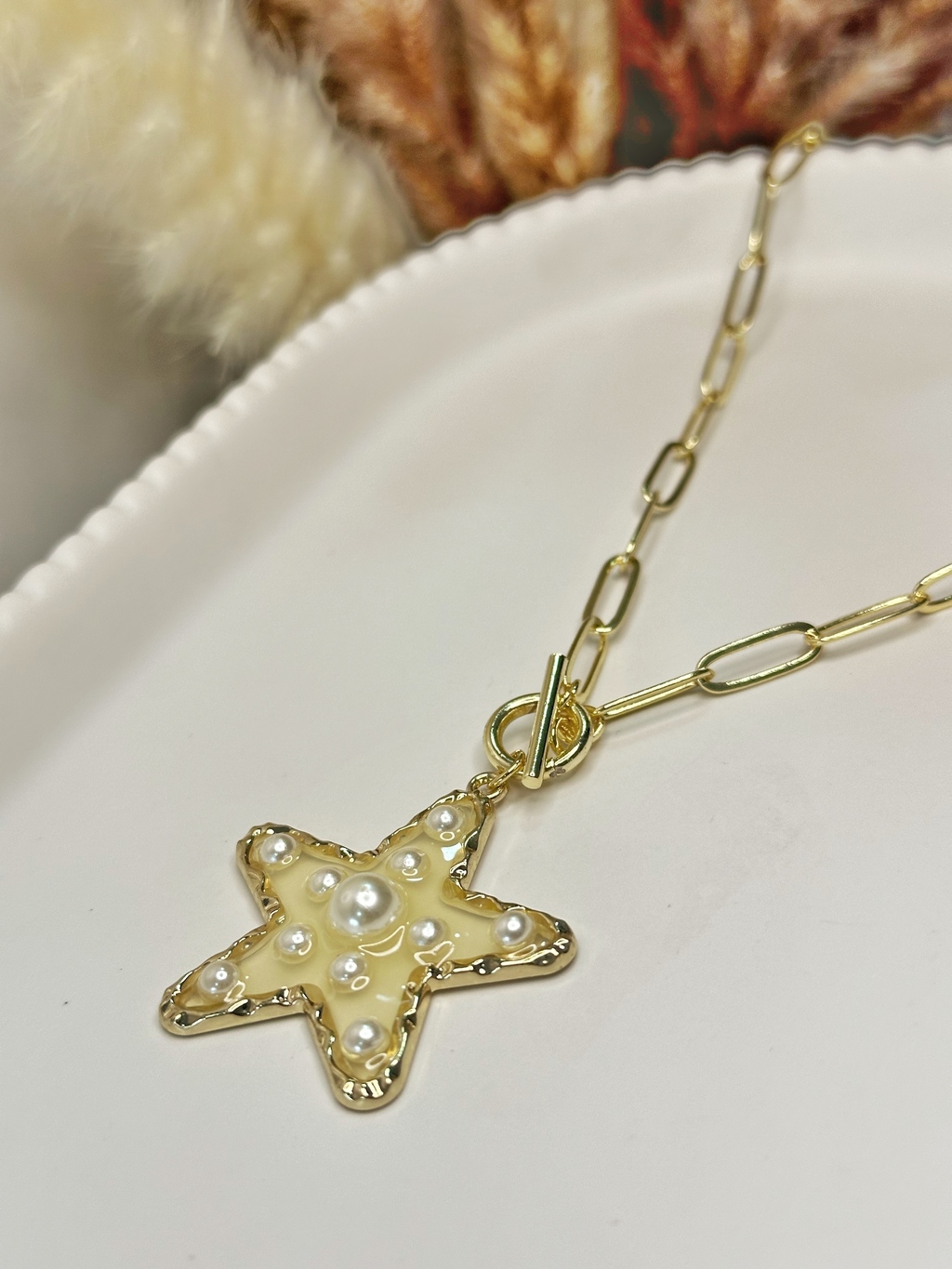 Un diseño moderno y sofisticado que combina una cadena de eslabones con cierre de timón y un dije de maxi estrella adornado con perlas.
